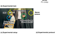 Recently, it has been reported that body ownership can be induced to an empty space by presenting visual-tactile stimuli17,20,21. An entire invisible body ownership is induced when participants observe a paintbrush moving in an empty space and by defining the contours of an invisible body through an HMD from a first-person perspective while receiving simultaneous touches on the corresponding parts of their real body. The illusory ownership of an entire invisible body reduces autonomic and subjective social anxiety responses caused by standing in front of an audience20. In contrast, an illusion of missing body parts through illusory ownership of an amputated virtual body can be induced by eliminating a virtual (visual) body part and not applying physical touches to the body part corresponding to the missing part22. This illusory experience of amputation decreases corticospinal excitability of the illusory amputated body part.