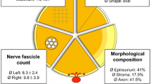 Nerve fascicle number correlated strongly positively with the number of subepineural vessels (r = +0.67, p < 0.001) and moderately positively with the number (r = +0.31, p = 0.05) and maximum diameter of the subepineural vessels (r = +0.42, p = 0.005). Another significant moderately positive correlation was found between number of subepineural vessels and CSA (r = +0.35, p = 0.017), and between nerve fascicle number and CSA (r = +0.40, p = 0.005).