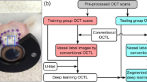 A custom-made (Systems Engineering, Tokyo, Japan) swept-source OCT system that utilised a swept laser operated at a centre wavelength of 1310 nm (Axsun, Billerica, USA) was used to acquire OCTD images (see Supplementary Fig. S2). A schematic of the OCT system is shown in Supplementary Fig. S3. The final illumination power transmitted into the eye was 14 mW, which was within the safety limits specified by the American National Standards Institute18. The axial resolution of the system, determined by the effective sweep range of the laser (96 nm), was 13 µm in air and 9 µm in tissue, assuming a tissue refractive index of 1.42. A cube scan obtained with this system contains 1024 × 400 A-scans (scan area, 7 × 7 mm; axial depth, 5 mm). The A-scan and B-scan rates were 50 and 100 Hz, respectively. Multiple joints that allowed for movement in three planes were added to the bottom of the OCT probe to allow appropriate probe positioning and stabilisation.