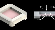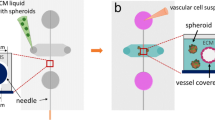 Before the actual printing process, the distribution of single droplets in the core structure was calculated using a slicing algorithm, slicing the structure at different heights, and calculating evenly spread droplet positions for the resulting longitudinal sections. However, the deposit positions of droplets for the channel wall were calculated by slicing the channel lengthwise and determining single droplet positions by using an angular calculation along the outlines of the channel cross sections. This technique maintains an even distribution of the SMC layer over the channel surface for all heights. The reactors were kept at 5 °C for the entire printing process by a temperature-controlled platform. At first, the dissolvable core was printed with gelatine (either pure 5% or 3% with additional 10–12 million HUVECs per millilitre) from the first printer head at 37 °C using an electromagnetic micro valve with 0.15 mm diameter. Afterwards, two additional printer heads with 0.3 mm diameters were used to create the channel walls mimicking the tunica media. The described crosslinker solution was used in a second printer head and the Fib 2.5% solution containing 6 million SMCs per millilitre was used in a third printer head. The printing pressure was set to 0.5 bars and the valve opening time to 450 µs to achieve a stable droplet volume and a high level of viability54. For each calculated droplet, at first one droplet of crosslinker solution followed by one droplet of fibrinogen-cell solution was printed, accomplishing a direct crosslinking within the process that resulted in a thin layer around the core material. The upper part of the presented model containing the surrounding fibroblasts was cast after the printing process was completed using a hydrogel mixture of fibrinogen and collagen (1.25% FibCol), which was quickly crosslinked using thrombin in a final concentration of 8 U/ml. After the printing process, the core material was washed out under laminar flow using warm (37 °C) sterile PBS gently pipetted into the open channel three times (Supp. Video 3). Then, in case no HUVECs were printed in the first step, 1 million HUVECs per construct were suspended in 300 µl of cell culture medium and pipetted through the channels until the medium was visible on the other side of the channel. Afterwards, the channels were closed using silicon tubes at both ends and incubated upside down for about four hours. The remaining liquid and non-attached cells were washed off using culture medium. For the long-term cultivation of up to three weeks, cell culture medium was perfused via silicon tubes using a peristaltic pump at a speed of 0.1 ml/min at 37 °C with a CO2 level of 5% and the medium was changed every two to three days. The medium reservoir had air exchange via a 0.2 µm SCFA-button-filter and up to four reactors were perfused in a row at once with a single pump and medium reservoir.