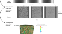 To convert the gray value to salt concentration, we followed the calibration method described by Shokri21. Briefly, to calibrate the gray values, CaI2 solutions with concentration of 2%, 5%, and 25% (by mass) were imaged at the same energy levels above and below the Iodine K-edge value. A linear equation was obtained relating the known values of concentrations to the corresponding gray values of the solutions with a well-defined concentration. The linear equation was used as the calibration curve to relate the gray value at any given pixel and time during evaporation from sand columns to the salt concentration. This enabled us to delineate the temporal and spatial solute distribution at the pore-scale during evaporation.