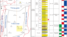 The hydro-mechanical simulation initial configuration consists of a rectangular box with a dimensionless extent of 30 × 30 × 60 in the x, y (horizontal) and z (depth) directions, respectively. The initial porosity follows an anisotropic Gaussian random-field distribution, with a standard deviation equal to 1, and correlation lengths of 5, 5, 1 in the x, y and z directions, respectively. Further, a high-porosity cylindrical ellipse is located at the first ¼ of the domain height and represents a fluid-rich source region or reservoir. Permeability values within the source region were nine times higher compared to normalised background values of 1 (Fig. 6). The computational domain was subjected to the downward-pointing gravity field and affected by a background horizontal strike-slip shear-deformation of similar magnitude than buoyancy forces. The pore-fluid is twice as buoyant as the solid. The mechanical problem was solved using free-slip (no shear stress) boundary conditions on all sides of the box. For the fluid flow problem, we applied no flux boundary conditions on all vertical sides of the box, and fixed flux value at the bottom and top boundaries to satisfy the condition \({p}_{e}=0\) (no compaction or decompaction). A total number of 10,000 time steps was necessary to obtain the results. The dimensionless parameters used in the code (Table 1) allowed us to optimally converge the numerical simulation.