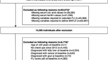 This is a retrospective, single-center, cohort study in Japan to clarify the risk factors for developing FLD. The database was from the Center for Preventive Medicine, St. Luke’s International Hospital, Tokyo, Japan. The study analyzed 13,201 Japanese subjects who underwent annual medical examinations at the center in 2004 and were reevaluated five years later. We used FLI to assess FLD47. This is a well established algorithm based upon BMI, waist circumference, triglycerides, and gamma-glutamyl-transferase (GGT) that is shown to have an accuracy of 84% with a cutoff value of <30 to rule out hepatic steatosis (sensitivity of 87% and a negative likelihood ratio of 0.2) and FLI ≥ 60 to rule in (Specificity 86%, positive likelihood ratio 4.3). We included the subjects between the ages 20 and 75 years old at the baseline (2004) given this was the age cutoffs in the validation study47. We excluded the subjects with hepatitis B (HBs antigen positive) and C (HCV antibody positive) virus infection and subjects with FLD (FLI ≥ 60) at the baseline. We also excluded the subjects on medication for hypertension, dyslipidemia, diabetes mellitus, and hyperuricemia and/or gout. When the subjects had more than one annual examination, we only used the first examination of that year to avoid counting the individual twice. Every subject had the same work-up, including medical history, routine physical examination, and blood tests collected in this database and detailed in previous publications48,49,50,51. We evaluated the cumulative incidence of FLD from normal liver (FLI < 30) and borderline FLD (30 ≤ FLI < 60) at baseline. Moreover, we evaluated risk factors for developing FLD both from normal liver and from borderline FLD over five years and calculated ORs. Finally we prefer to use the term FLD over NAFLD even though we adjusted for drinking habits given total intake was not assessed nor were other rare causes of FLD such as celiac or certain medications eliminated from analysis52.