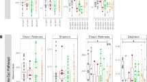 Paired-end Illumina reads were trimmed for 16S rRNA gene primer sequences using Cutadapt (https://cutadapt.readthedocs.org/en/stable/) and sequence data were processed using the Quantitative Insights Into Microbial Ecology (QIIME-1.9.1) software suite58. Successfully merged reads were quality filtered in QIIME using default settings. Thereafter, sequences were clustered into OTUs on the basis of similarity to annotated bacterial sequences available in the Greengenes database (v13.8; http://greengenes.secondgenome.com/; 97% sequence similarity cut-off) using the UCLUST software within QIIME. Sequences that could not be matched to references in the Greengenes database were clustered de novo based on pair-wise sequence identity (97% sequence similarity cut-off). The first selected cluster seed was considered as the representative sequence of each OTU. Taxonomy assignment of representative sequences was accomplished with the UCLUST software. Singleton OTUs were removed prior to downstream analyses. Cumulative-sum scaling (CSS) was applied, followed by log2 transformation to account for the non-normal distribution of taxonomic counts data. Statistical analyses were executed using the Calypso software59 (cgenome.net/calypso/). Samples were ordinated using Principle Coordinates Analysses (PCoA) based on weighted UniFrac distances. CCA was then performed, including infection status and time point as explanatory variables. In addition, Permutational Multivariate Analyses of Variance Using Distance Matrices (Adonis)60 was used to calculate the portion of variability in the data explained by the explanatory variables, and a biplot was generated in R61. Following rarefaction of raw data, differences in microbial alpha diversity (Shannon diversity) and richness between S+ and S− groups, as well as in the abundance of individual taxa, were evaluated using ANOVA. Beta diversity was calculated using weighted UniFrac distances and differences in beta diversity were calculated using Analysis of Similarity (ANOSIM)62. Differences in the composition of the microbiota between groups were assessed using the Linear discriminant analysis Effect Size (LEfSe) workflow63. Following the completion of bioinformatics analyses using QIIME (QIIME-1.9.1), QIIME2 was released (QIIME2-2018.4; https://qiime2.org). Therefore, in order to ensure that no substantial differences in findings could be detected when performing data analysis and annotation using this updated software, we undertook separate bioinformatic analyses and compared the resulting findings with those originally obtained using QIIME-1.9.1. In addition, reproducibility of findings was also ensured by replacing the Greengenes database with the SILVA reference database (https://www.arb-silva.de/download/archive/qiime; Silva_132) for sequence data annotation. Briefly, no major differences were detected between findings generated with QIIME-1.9.1 or QIIME2-2018.4 and using the Greengenes or SILVA repository as reference databases. Thus, the results from these additional analyses are not shown in the main article. Nevertheless, individual data files displaying findings from these analyses (e.g. differences in microbial alpha and beta diversity between mouse groups and infection time points, as well as differences in the relative abundances of individual OTUs) are available from the Mendeley database at https://doi.org/10.17632/y8c7vpc8zp.1.