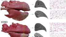 Following euthanasia by intravenous injection of barbiturate, the heart and lungs were removed from the carcase following standard necropsy protocols. The pulmonary circulation was perfused via the pulmonary artery with 2 litres of PBS before the heart was dissected away. The lungs were then photographed before being presented for further processing. Lung tissue was fixed over seven days by airway instillation of 10% neutral buffered formalin in a manner similar to that previously described29.