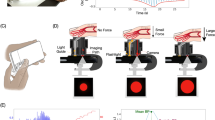 Figure 1a illustrates the oscillometric cuff BP measurement principle, and Fig. 1b shows the application developed to extend the principle to measure BP with the latest iPhone (X model). The front of this phone is all screen, except for a small notch that includes the camera for taking “selfies”. The application employs this front camera as the PPG sensor where the light source is ambient light and/or screen light (bright setting, which we anecdotally found to suffice in the dark). Spatial averaging followed by band-pass (1.8–4.3 Hz) filtering of the red video channel is applied to extract the blood volume oscillations. The application employs the strain gauge array under the phone screen (but not the notch) for employing “peek and pop” via “3D Touch”7 as the force sensor. Apple’s UIKit is used to extract the strain gauge output8. Through placement of high density weights on the screen adjacent to the camera, the application derives force (F, grams) from the strain gauge output (V) as F = 443.75 V, where V takes on 400 levels from 0 to 0.83 (firm setting). Like our previous device6, the application plots the data as they are recorded to visually guide the finger actuation.