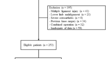 In addition, we observed an increased incidence of ACL injuries associated with a greater degree of LPW and smaller aLPD. Our findings were remarkably different from previous studies. Previous studies have shown that valgus moments on the knee joint have been suggested as a risk factor for anterior cruciate ligament (ACL) injuries during single-leg landing25,26,27. We hypothesized that lateral plateau widening might represent the energy of valgus stress applied on knee joint. Therefore, the greater the energy applied on the lateral tibial plateau, the greater the degree of lateral widening and the greater the incidence of ACL lesion can be expected. The area of tibial plateau depression, on the other hand, represented the energy of axial loading transmitted from femoral condyles to the tibial plateau. Hence patients with smaller aLPD might sustain much shear force or valgus stress rather than compression force, which could easily result in ACL pathology if the ACL substance or ACL insertion is compromised. Another potential explanation is that fractures with obvious plateau widening and moderate depression area were often classified as Schatzker type V or VI. Patients that sustained a Schatzker type V or VI fractures would be prone to sustain an ACL lesion. Lacking evidence of biomechanical trials, these findings should be further explored in cadaveric models.