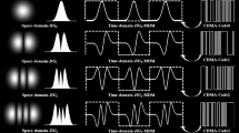 Figure 2b shows the transmission of TE (red line) and TM (blue line) resonance modes using an Finite-Difference Frequency-Domain (FDFD) simulation for the designed single GMR filter with an infinite grating period and THz beam diameter, when the THz wave from the air is incident perpendicularly to the GMR filter. Two strong TE resonance modes appear at 0.402 and 0.581 THz, and one strong TM resonance mode appears at 0.466 THz. Because these resonance frequencies are sufficiently far away from the Rayleigh anomaly frequency (\(c/(\sqrt{{\varepsilon }_{inc}})\times \wedge \)) = 0.6517 THz)33,34, only the GMR effect can achieve the resonances with a high Q-factor. The yellow area indicates the only frequency range over which the first diffraction mode (m = ±1) can exist. Figure 2c shows the transmission when the incident material is not air but Teflon. Only one strong TE and TM resonance mode exists in the green region, which indicates that only the first diffraction mode (m = ±1) can exist.