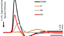 On the 14th day after surgery, the animals were anesthetized with intraperitoneal injection of pentobarbital sodium (60 mg/kg). The body temperature of animal was maintained at 37 °C. Sciatic-tibial motor nerve conduction velocity (MNCV) was measured by the stimulation of sciatic and tibial nerves at the sciatic notch and tibial notch through the bipolar needle electrodes (Power Lab/ML856; AD Instruments, Australia) at the 0.10 Hz frequency, 0.1 ms duration and 1.5 V amplitude. After single stimulus the compound muscle action potential was measured from the first interosseous muscle of the hind-paw by unipolar pin electrodes. The recording was typical biphasic response with an initial M-wave which is a direct motor response owing to stimulation of motor fibers. The MNCV was calculated as the ratio of the distance (mm) between both sites of stimulation divided by the difference between proximal and distal latencies recorded in ms32,56.