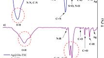 UV-vis spectroscopy measurement (Fig. 1b) was done to investigate the reduction of metal salts into metal NPs in presence of RFRA extracts. The colour change from yellow to brown was observed due to the reduction of Ag ions to Ag NPs by active molecules of extracts. This may be attributed to the surface plasmon resonance (SPR) of as-prepared Ag NPs. The absorption spectrum revealed a maxima peak at 455 nm (λSPR), confirmed the formation of Ag NPs. Generally, the previously synthesised Ag NPs demonstrated the SPR band in the region of 395–420 nm22,23. The red shifting of the SPR band was noticed due to in-situ conjugation of extract with Ag NPs to form biohybrid24. Broad absorption was noticed from 415 to 660 nm due to the localised SPR. It can be described by the well-known Mie resonance condition25. The lower wavelength absorption can be ascribed to bioorganic molecules, which are present in the RFRA extracts.