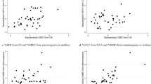 Table 3 represents the cumulative rate of decrease in VPD (as a percentage) with the age range for each density grade (the VPD in the group aged 35 to 39 years is the baseline) and shows the trend of declining MD in healthy Taiwanese women. In density grade groups “a” and “b”, the percentage of the cumulative rate of decrease in VPD was negative (this means that VPD increased with age) and presents the opposite trend as those observed in grades “c” and “d”. Table 3 also shows that the MD at age 50 years is a significant boundary and that the greatest decrease occurs from 45 to 55 years. In the 45–50-year and 50–55-year age groups, the proportion of decline in total mean MD was from 12.79% to 19.31%. This significant trend in the DV/VPD decline is also observed in the 45–55-year age range in Fig. 2.
