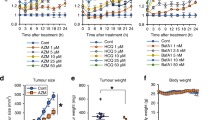 Overlaying all the individual animal level data for tumor volume versus ZMP levels from Fig. 5 shows a dose response curve for ZMP with an IC50 of 108 ± 78 μM (Fig. 6D) regardless of tumor type. Tumor volume decreases with increasing ZMP; however, in these solid tumors there was no evidence for AMPK activation, either using AMPK phosphorylation at T172 or downstream measures at P70S6K T389. Salvage of purines in vivo may explain the absence of purine changes; therefore, we measured levels of hypoxanthine for mouse plasma to be 0.36 ± 0.02 μM (n = 5) which was lower than that reported by Slowiaczek et al.23. We also quantified hypoxanthine in human plasma, finding the levels were 2.07 ± 0.01 μM (n = 5), well within the 0.45–34 μM range reported in the literature19,23,24,25,26,27,28,29.