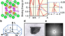 Figure 1 shows the atomic structure of BaMnBi2 and BaZnBi2. These materials consist of alternating layers of Bi-net and Mn (or Zn)-Bi tetrahedra separated by Ba layers located in mirror symmetric positions with respect to the Bi-net (upper right panel of Fig. 1a), satisfying I4/mmm space group symmetry. Table 1 compares the lattice constants and ionic radii of A-site ions for other AMnBi2 compounds with BaZnBi2. With A-site cations of smaller ionic radius, the atomic structure takes up the P4/nmm space group, in which the A-site cations are located at staggered positions, breaking the mirror symmetry with respect to the Bi square net13. We find by X-ray diffraction that the space group of both BaMnBi2 and BaZnBi2 are I4/mmm, confirming the sensitivity of the space group to A-site. Moreover, for AMnBi2 compounds with the I4/mmm space group, the c/a ratio is measured to increases with increasing A-site ionic radius, as expected. A unique feature of the crystal structure associated with this family of materials is that there are two types of Bi atoms in the unit cell: one consisting of the Bi-net (defined as Bi1) and the other forming the Bi-tetrahedra around the Mn (or Zn) cations (defined as Bi2). It has been pointed out that states near EF of AMnBi2 compounds are dominated by Bi1-p orbitals whereas the Bi2-p states that hybridize with the Mn-d orbitals are away from the Fermi level13. We note that the c/a ratio of the BaZnBi2 is dramatically smaller than those reported for the Mn family, a reduction that can be primarily attributed to the reduced Zn-Bi distance and that reflects differences in the nature of bonding between Zn-Bi and Mn-Bi. With the small binding energy of the Bi2-p states in AMnBi213, the expected change in the bonding character in BaZnBi2 should induce a significant change in the states near the EF, which will be discussed later in our ARPES data and first-principles results.