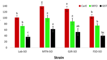 The oxidase (df = 3; F = 9.8; P = 0.005) and GST (df = 3; F = 0.7; P = 0.04) activities only exhibited significant differences between weevil species (i.e., S. zeamais and S. oryzae) (Fig. 3A,B). However, when the activities of these enzymes were compared between strains of the same species (i.e., between SzSusc and SzPyrSel for maize weevils and between SoPyrTol and SoPyrR for rice weevils), no significant differences were observed (Fig. 3A,B). Furthermore, no significant differences were observed for the activity of general esterases (df = 3; F = 1.8; P = 0.22; Fig. 3C).