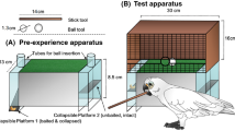Nevertheless, goal-oriented modification of pliable materials has been studied prior to the existence of the avian hook bending paradigm: Povinelli et al.20 tested whether seven juvenile chimpanzees would straighten one end of an S- or C-shaped wire in order to push it into a hole to obtain a reward. One chimpanzee was able to successfully manipulate the wire, but only after receiving demonstrations by the experimenter and additionally being trained to unbend the wire in absence of the apparatus. Furthermore Klüver (1937) and Anderson & Hennemann (1994) tested whether capuchin monkeys (n = 121; n = 222) could unbend a circular wire in order to insert it into a honey-dipping apparatus. One male straightened and used the wire as a tool. But as Weir & Kacelnik23 pointed out, the authors did not provide enough information to draw conclusions whether the capuchin unbend the wire in an intentional goal-directed way.