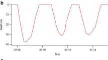 From January 5 to 28, 2015, we deployed ARGOS satellite transmitters on 12 Adélie penguins (8 female, 4 male) that nested on Torgersen Island (64°46′S, 64°5′W), and from January 27 to February 7, 2015, we deployed satellite transmitters on 7 gentoo penguins (2 female, 5 male) at Biscoe Point (64°49′S, 63°46′W). All protocols were carried out in accordance with the approved guidelines of the Columbia University Institutional Animal Care and Use Committee (Assurance #AAAH8959). Tagged penguins were paired and had brood-stage nests containing two chicks. Penguins were equipped with SPOT 5 satellite transmitters (Wildlife Computers Redmond, WA, USA) and Lotek LAT1400 time-depth recorder (Lotek Wireless, Inc, St. John’s Canada; resolution of 0.05 m, accuracy of 2 m) sampling at 2 Hz. Dive depths less than 5 m were not recorded to save space on the memory cards. Transmitters were attached to the anterior feathers on the lower dorsal region using waterproof tape and small plastic zip ties. Transmitters were removed and rotated to new penguins every 3–5 days dependent on weather conditions. Penguin locations were filtered to remove inaccurate location data due to erroneous terrestrial positions, unreasonable locations based on swimming speed and coastal geometry, following published the data processing methods37. We time-matched dive records to location data and the maximum dive depth was determined for each dive. Penguin dives were classified into transit, search and foraging dives, where foraging dives consisted of wiggles, plateaus or bottom time where prey was likely pursued (see37 for more information). The convex hulls of penguin locations were computed using chull in the grDevices package53.