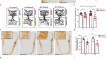 Mice were habituated to one odor (isoamyl acetate, diluted in mineral oil at a concentration of 0.02%) for four sequential 2-min presentations separated by 2-min inter-trial intervals, followed by a single presentation of one novel odorant (2-heptanone diluted in mineral oil at a concentration of 0.02%). The magnitude of the novelty response to the novel odor indicates the mouse’s ability to detect the odorant and discriminate it from the previous odorant (Fig. 2a1). Both odors were presented by placing 50 μl of the odorant mixture onto a cotton bud that was placed on a hole of the cage. The amount of time that the mice spent actively investigating each presented odorant was measured with a stopwatch. Active investigation was defined as directed sniffing within 1 cm of the odor source.