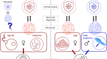 In contrast to maternal and paternal genes that are inherited in a Mendelian manner, the microbiome was originally acquired from the environment. Its transfer from parents to offspring revitalizes aspects of Lamarckism4. Siblings have a more similar microbiome than unrelated newborns, and a litter harbours offspring with more similar microbiota than offspring from different litters17,18,19,20. This implies that both the environment and the genetic background shape the early microbiome composition21,22. The maternal environmental experience may thus modulate the embryonic immune system in two ways: via the direct transfer of immunity23 and via the transfer of commensal bacteria24. This suggests a co-adaptation between parental investment, the host microbiota and the immune system.