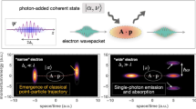 where e is the elementary charge, ψi and ψf are the initial and final electron wave functions, respectively, SF is the electron propagator, and \({A}_{i}\equiv ({A}_{i}^{0},{{\bf{A}}}_{i})\) and \({A}_{f}\equiv ({A}_{f}^{0},{{\bf{A}}}_{f})\) are the initial and final photon fields, respectively. We choose the Lorentz gauge and A0 = 0 for the photon field and define the final photon momentum as q ≡ (|q|, q) = (|q|, qT, qz). The electron and photon fields are written as