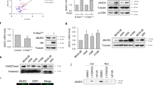 Result of IHC analysis of 128 gastric cancer tissues from four different histological stages indicated that JMJD3 protein expression is increasingly elevated with histological stage (Fig. 1A,B). Moreover, this study showed that JMJD3 transcripts were significantly increased in gastric cancer tissues from 41 cases when compared with paired adjacent normal tissues (Fig. 1C). We also found that high JMJD3 expression predicted unfavorable survival both in the 128 patients cohort (Fig. 1D) and in TCGA data (Fig. 1E). Multivariate analysis of the 128 patient cohort showed that JMJD3 was an independent prognosis predictor in GC (Table 1). Consistent with our result, bioinformatics analysis in cBioportal also revealed that JMJD3 expression increased along with tumor stage (Fig. 1F) and high expression of JMJD3 was associated with poor disease progression (Fig. 1G,H). The two JMJD3 transcript variants were also found to be upregulated in GC compared with normal tissue from The Human Protein Atlas (Fig. 2A). In accordance with our findings, Shen et al. observed that JMJD3 transcripts were significantly elevated in renal carcinoma and that JMJD3 expression was higher in cancer tissue compared to adjacent normal tissue8. JMJD3 expression was also found to be significantly higher in prostate cancer and further increased during metastasis9,10. Similarly, Sui et al. reported that JMJD3 expression was upregulated in glioma11. Conversely, Agger et al. found a significant decrease in JMJD3 expression in various cancers, including lung and liver carcinomas, as well as various hematopoietic malignancies6. Moreover, JMJD3 expression levels are lower in colorectal cancer relative to normal tissues7. Based on the above reports, we conclude that the expression patterns of JMJD3 are context and cancer type specific. For example, JMJD3 can promote breast cancer cell invasion through upregulation of the EMT-specific gene-SNAI116. However, in colorectal cancer cells, a decrease in JMJD3 can significantly increase cell proliferation through cell cycle progression and apoptosis suppression7.