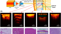 In conclusion, this is the first research on epidural space location using an optically assisted auxiliary with 405-nm laser. The optical location system presented by Ting et al. has been redesigned to further demonstrate and exploit the optical characteristics differences between ligamentum flavum and epidural space. A real-time optical signal receiving system has been developed to assist operators to accurately perform epidural anesthesia while avoiding dural puncture. The optically assisted auxiliary is used in 60 epidural punctures in in vivo porcine models, and the success rate of accurately guiding needle tip to epidural space was 87%. As a result, it has been verified that 405-nm laser beams have high tissue differentiation ability for epidural puncture operations. Most importantly, the developed auxiliary is able to quantify tissue reflection intensities and help operators efficiently guide the needle tip quickly and precisely entering the epidural space. Last but not least, the anesthesia operations using the developed auxiliary are similar to the traditional procedures as compared to other technologies29,30,31,32,33,34,35,36,37,38.