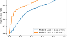 Receiver operating characteristic (ROC) curves of the logistic models and areas under curves (AUCs) were calculated.