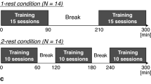 In Task C, participants were asked to perform the reverse Stroop task, which was identical to that used in our previous study9. The participant was required to press the button corresponding to the name of the color denotated by the word presented on the screen, as quickly and accurately as possible. After every five reverse Stroop task trials, the participant was asked to answer whether they were fatigued or not at the time by pressing the left or right button, respectively, as quickly as possible after perceiving fatigue. The letter presented on the center of the screen was updated every 450 ms, as in Task A. They were also asked to memorize the letter that was presented at the time they perceived the fatigue and to report that letter by selecting one of three letters presented on the screen, just as in Task A (Fig. 1C). A sequence of 80 presentations constituted one session, and five sessions were performed in a row with about 5 min between sessions.