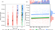 In our study, Non-Attendant individuals were 10% more likely than expected to remain Non-Attendant (Table S3), although 76% of individuals returned to breeding colonies the subsequent year. Temporary emigration can reduce conspecific conflict and food competition but precludes breeding opportunities and may increase predation risk because there is more open water access for predators75. We found that the probability of colony attendance fluctuated across years, with more Non-Attendants and less Attendant Parturients following years of early (2015) or late (2016) ice break-out relative to years with more typical ice break-out phenology (Table 1). In juvenile Weddell seals, increased sea ice extent has been found to result in more frequent emigration, probably because higher sea ice extent corresponds to lower primary production and presumed lower foraging success69, which in turn lowers the number of individuals able to reach the body condition threshold necessary for attending colonies76. Another explanation is a shift in age structure following highly productive years77 to a higher frequency of older females, which are more likely to become Non-Parturient78 and Non-Attendant39. In our study, inter-annual variation in colony attendance is likely an interaction between shifts in population age structure and fluctuating environmental conditions.