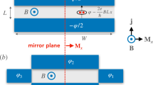where jc is the maximum critical current density in the demagnetized region and Q is the ratio of the critical current densities in the magnetized and demagnetized regions - i.e. \(Q={j}_{m,c}/{j}_{c}.\) The net exchange field in the magnetised regions can favour a transition to a π-state50,51 and hence the directions of jc and jm,c can be opposite to each other meaning Q can be negative. The total critical current through the junction is thus \(I={\int }_{\frac{w}{2}}^{\frac{w}{2}}{\int }_{-L/2}^{L/2}j(x)dxdy=w{\int }_{-L/2}^{L/2}j(x)dx\), where w is the junction width in the y direction. From symmetry, the maximum critical current is therefore achieved by setting φ0 = π/2 which yields