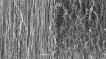 DIC is an image processing technique that can be applied to two-dimensional images exhibiting a wide range of randomly distributed grey levels43. The reference image, corresponding here to the sample at rest, is first divided into square regions called subsets. As each subset has a particular distribution of grey levels, it (and thus its position) can be tracked in subsequent images of the deformed sample. This yields the in-plane displacement fields within the analysed area, from which the strain fields can be derived. Comprehensive details about the DIC technique can be found in Sutton et al.44. The software used in this study is CorrelManuV45,46. Even though DIC is regularly used to analyse strain fields at the macroscopic scale in bulk materials (polymers, cement) enhanced with carbon-nanotubes47,48,49,50, only Maschmann et al.37 so far have tackled the application of DIC to a CNN (namely, to vertically aligned 30 μm-wide and 75 μm-tall pillars made of CNTs). However, the resolution of the method does not reach the CNTs themselves. In the images obtained herein, whatever the magnification, the CNT depositions show contrasted grey levels, whereas the substrate—when visible—corresponds to a rather uniform shade of grey. The present paper thus proposes the application of DIC to sub-micron features exhibiting contrasted grey levels within the CNN in order to access motions at the scale of CNTs. Hence, once the initial grid of subsets is generated for the whole image, subsets falling onto the substrate are identified and excluded from the correlation process. This concerns all high-resolution images as well as the 2-layer sample imaged at lower resolution and it explains why some strain fields presented in Section 2 appear sparse. The subset size is taken as 30 × 30 pixels on low-resolution images and 80 × 80 pixels on high-resolution images, thus yielding the respective resolutions of 928 nm and 391 nm for a subset. Note that the choice of subset size derives from a compromise between precision and resolution of the strain fields (a larger subset leads to better precision but to lower resolution). Additional information regarding DIC uncertainty estimates can be found in the Supplementary Information; the uncertainty on strain is reported in Table 1.