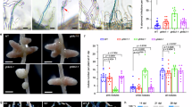 M. truncatula cv. Jemalong A17 seeds were scarified, germinated, and grown in a growth room at 22 °C under 16 h light/8 h dark conditions. For rhizobium inoculation of the seedlings, germinated 1-day-old seedlings were planted on the aeroponic caisson, a large plastic chamber with a perforated lid on top and a humidifier that sits on the bottom37, where they were misted with Lullien’s aeroponic culture medium38 containing 0.5 mM ammonium nitrate. The 2-week-old seedlings were inoculated with S. medicae ABS7M (pXLGD4) constitutively expressing the LacZ gene at an optical density at 600 nm (OD600) of 0.1. For rhizobium inoculation of A. rhizogenes-mediated transformed roots, 4-week-old transformed plantlets were transferred to Perlite in 1 L pots and maintained for 2 weeks with a supplement of half strength modified Fahraeus medium (mFM) containing 0.5 mM ammonium nitrate. Six-week-old transformed plantlets were then inoculated with S. medicae ABS7M (pXLGD4) at OD600 of 0.05.