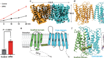 XPR1 is a conserved and ubiquitously expressed SLC, which we previously identified as the only known metazoan inorganic phosphate exporter10. Phosphate export mediated by XPR1 can be efficiently assessed by a complementation assay, in which the knockdown of endogenous XPR1 by an siRNA directed against XPR1 3′UTR and the ensuing decreased phosphate efflux are compensated by the de novo transfection of an XPR1 expression vector that is not recognized by the siRNA10. Upon introduction of WT XPR1, siRNA-mediated decreased phosphate efflux was fully complemented, while complementation by the p.(L612_696Tdel) construct, which was not expressed at the cell surface, was similar to that of an empty control vector (Fig. 4a, left panel). Noticeably, the three PFBC variants had different levels of complementation for the phosphate exporter function, with the p.N619D variant showing the most marked defect (Fig. 4a, left panel). Importantly, this defect was observed only for phosphate efflux, as phosphate uptake remained unchanged for all constructions, thus confirming the specificity of XPR1 for phosphate export (Fig. 4a right panel).