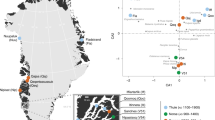 The differences between the carbon and nitrogen isotopic compositions in belugas and narwhals, while relatively small, suggest distinct foraging behaviors, consistent with what has been reported for these two species in the North Water Polynya40. The unusually high δ13C value for MCE1356 suggests a unique diet for this individual. Because bone collagen remodels at a slow rate, reflecting the diet over the last several years of an animal’s life41, this unique diet reflects sustained differences in prey consumption or habitat use, and cannot be ascribed to unusual short-term variation. High δ13C values are observed in marine animals that forage to a greater extent on benthic relative to pelagic prey42. Accounting for the differences in fractionation with trophic level, bearded seals (Erignathus barbatus) and walrus (Odobenus rosmarus) tend to have the highest δ13C values of any Arctic marine mammal, consistent with their strong reliance on benthic prey40.