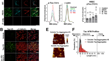 His-hTau 2N4R or myc-hTau 2N4R P301S were overexpressed in BL21 Star (DE3) pLysS bacteria and purified as previously described73. Briefly, pelleted cells were resuspended on ice in high-salt RAB buffer pH 7 (0.1 M MES, 1 mM EGTA, 0.5 mM MgSO4, 0.75 M NaCl, 0.02 M NaF, 1 mM PMSF, 0.1% protease inhibitor cocktail (100 μg/ml each of pepstatin A, leupeptin, TPCK, TLCK, soybean trypsin inhibitor and 100 mM EGTA), homogenized, boiled at 100 °C for 10 min and then rapidly cooled on ice for 20 min. After centrifugation at 70,000 g for 30 min, the supernatant was dialyzed into FPLC Buffer (20 mM piperzine-N,N′-bis (2-ethanesulfonic acid), 10 mM NaCl, 1 mM EGTA, 1 mM MgSO4, 2 mM DTT, 0.1 mM PMSF pH 6.5), and applied to a 5 mL HiTrap Sepharose HP IEX cation-exchange (SP sepharose) column (GE Healthcare). Tau was eluted using a 0- to 400 mM NaCl gradient in FPLC Buffer. Peak fractions were pooled and dialyzed into 100 mM sodium acetate pH 7, and concentrated to approximately 5 mg/ml using an Amicon spin concentrator (Millipore). Final protein concentration was determined using bicinchoninic acid protein assay (BCA, Pierce).