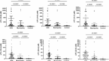 Interestingly, when we measured the CSF levels of ATX and ATX activity (LysoPLD), which strongly correlate with each other in serum15, the difference in the CSF levels of ATX and LysoPLD was not statistically significant among the control, mild NPSI LSS, and severe NPSI LSS groups (Fig. 2A). In contrast, a significant positive correlation between the CSF levels of ATX and LysoPLD was found in the severe NPSI LSS group (rs = 0.85), whereas there was little or no correlation in the mild NPSI LSS group (rs = 0.13) and the control group (rs = 0.38) (Fig. 2B).