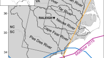 A long term record of precipitation events in the Neuse River basin at Kinston, NC was assembled from National Oceanic and Atmospheric Administration Cooperative Observer Network sites 314684 (1 September 1899 to 15 June 2017) and site 314689 (15 June 2017 to 5 December 2018). Data from 1 May 1919 to 29 November 1923 were not available. Precipitation events were defined as daily precipitation greater than 4.85 cm, the 99th percentile of daily precipitation. Consecutive days of rainfall greater than 4.85 cm were considered the same event and assigned to the day the event began. Precipitation events were ascribed to tropical cyclones when a precipitation event was coincident with the passage of a tropical cyclone within 240 km (150 miles) of Kinston, NC as determined by 6 h storm advisories recorded in the National Hurricane Center’s HURDAT2 database. Quantile regressions were constructed for the 90th and 50th quantiles of cyclone related precipitation against time. 95% confidence intervals on slopes for the quantile regressions were determined by 1000 rounds of bootstrapping. A long term record (1 May 1930 to 8 December 2018) of high river flow events for the Neuse River was assembled from the USGS gage at Kinston, NC (USGS gage 02089500). High flow events were those during which the daily average flow was greater than 390 m3 s−1, the 99th percentile of daily average flow. Consecutive days of flow greater than 390 m3 s−1 were considered the same event and summed from the day the event began to determine the total event discharge. Discharge events were ascribed to tropical cyclones when a discharge event followed within a seven-day period the passage of a tropical cyclone within 240 km (150 miles) of Kinston, NC. Discharge was regulated by Falls Lake dam from 1982 to the present.