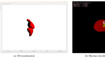 The presence of different phases within the biopsies translated into different peaks in the gray-level scale. Thus, the volume of each phase was obtained by multiplying the volume of a voxel by the number of voxels underlying the peak associated with the relevant phase. The Mixture Modeling algorithm, implemented as plugin in the NIH ImageJ software (https://imagej.net/Mixture_Modeling_Thresholding and https://imagej.nih.gov/ij/plugins/mixture-modeling.html)73, was chosen to threshold the portion of the histograms related to the two adjacent main tissues, namely the smooth muscle and the fibrotic collagen-based phase. The Mixture Modeling algorithm is a histogram-based technique that assumes that the histogram distribution is represented by two Gaussian curves. It calculates the image threshold as the intersection of these two Gaussians, finding a threshold that is, in several cases, very close to real world data. In our histogram data, the Gaussian curve on the left was representative of the smooth muscle, the second curve on the right of the collagen-phase. Indeed, in this range of densities should be included also the endothelial signal but the thickness of vessels, if excluding the pregnancy period, is negligible, not affecting the segmentation process. Therefore, we analyzed in each pathological biopsy, with the aforementioned algorithm, a dozen slices, uniformly selected in the axial direction: the selected threshold value was the average of all those obtained. Notably, for the selection of this threshold value, control biopsies were not examined because they were considered unreliable due to their low collagen content. An example of histogram segmented by the Mixture Modeling algorithm has been reported for a representative sample of P1-L in Fig. 4 of the Supplementary Material section.