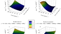 Urease activity was assayed according to the methods described by Kandeler and Gerber50. Briefly, 5 g of soil was placed into each of the three 50 ml incubation flasks. Two of them were treated with 2.5 ml of urea solution (720 mM) and 20 ml of borate buffer (0.1 M, pH 10), and third one was considered as control and only 20 ml borate buffer were added to it, and flasks were incubated for 2 h at 37 °C. After incubation, 2.5 ml of urea solution was added to control and 30 ml of potassium chloride (2 M) - hydrochloric acid (0.01 M) solution to all three flasks and shook for 30 min. All three soil suspensions were filtered using Whatman filter no. 4. After filtering the soil suspension, 5 ml of sodium salicylate-sodium hydroxide solution and 2 ml of sodium dichloroisocyanurate solution (3.91 mM) were added for color development. The absorbance of the color was measured at 660 nm using spectrophotometer. Also, to prepare standard curve, standards of 0, 1, 1.5, 2, and 2.5 µmol N ml−1 of ammonium chloride were prepared.