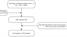 All the participants were of Chinese Han origin and had been diagnosed with T2DM by diabetologists. Participants with a fasting plasma glucose (FPG) below 7 mmol/l and glycated haemoglobin (HbA1c) below 6.5% undertook a 75-g oral glucose tolerance test (OGTT). Diabetes was diagnosed according to World Health Organization criteria, on the basis of an FPG ≥7.0 mmol/L, a 2-h plasma glucose during the OGTT ≥11.1 mmol/L, and/or HbA1c ≥6.5%. Individuals were excluded if they had typical clinical features of type 1 diabetes (severe insulin deficiency [fasting serum C peptide <0.1 ng/ml] or dependency on insulin treatment within 2 years of a diagnosis of diabetes); had another specific form of diabetes, such as diabetes secondary to chronic pancreatitis or steroid treatment; were positive for glutamic acid decarboxylase, islet cell, and insulin autoantibody; had abnormal red or white blood cells in their urine, or other kidney disease, such as urolithiasis; had cancer, infection, acute diabetic complications, autoimmune disease, a blood disease, or obstructive jaundice; had high serum alanine transaminase (ALT) activity (≥twice the upper limit of the normal range; had a white blood cell count <3.5 × 109/L, haemoglobin concentration <110 g/l in women and <120 g/l in men, or platelet count <10 × 109/L; or had a severe chronic liver disease, such as cirrhosis, viral hepatitis, or chronic alcohol-induced liver dysfunction.