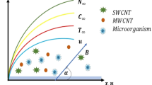 Here, (μnf, μf), (\({\rho }_{CNT}\), \({\rho }_{f}\)), (β, β*), γ1, B0, αnf, qr, Q0, \({(\rho {c}_{p})}_{nf}\), and \({(\rho {c}_{p})}_{f}\), Dm, Kr, Wc, Dn, (kf, knf, k), hf, (d, e), and V0 represent dynamic viscosity, density, thermal and solutal expansion coefficients, cone half-angle, magnetic field of strength, modified thermal diffusivity, thermal radiation coefficient, Dimensional heat generation/absorption parameter, heat capacities, Brownian diffusion coefficient, rate of chemical reaction, maximum cell swimming speed, diffusivity of microorganisms, thermal conductivity, convective parameter, reference temperature and concentration dimensionless constants and suction/injection parameter respectively.