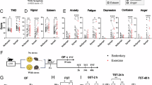 Forty-eight to 72 hours after the last VO2peak test, muscle biopsies were collected from the vastus lateralis muscle of the participant’s dominant leg. Following injection of a local anaesthetic (5 mL, 1% Xylocaine), incisions were made and the biopsy needle was inserted. Muscle samples were collected with manual suction applied37. The samples (50 to 200 mg) were then immediately blotted on filter paper to remove excess blood, and a small portion (5 to 15 mg) was immediately processed for the determination of mitochondrial respiration in SITU38; the remaining muscle was snap frozen in liquid nitrogen before being stored at −80 °C for further analyses. Following the pre-training baseline muscle biopsy, participants performed a single session of HIIE on an electronically-braked cycle ergometer (Velotron®, Racer Mate Inc, Seattle, USA). The session consisted of eight 2-minute intervals performed at an intensity between the individually-determined pre-training LT power and Wpeak (LT + 40% × [Wpeak − LT)), which were interspersed with 1-minute recovery periods at 60 W (work-to-rest ratio of 2:1). All participants were motivated and reached the expected loads during all eight 2-minute intervals. Muscle biopsy samples were also taken immediately after and 3 hours post the HIIE session27.