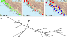 In both Discriminant Analyses of Principal Components (DAPC) performed with and without prior information of individual population membership we retained 50 principal components representing 77.97% of total genetic variation. The scatterplot of the first analysis (with prior; Fig. 2a) showed that along the first principal component the populations P05 Mariovo, P06 Mt. Kozuf, P08 Mt. Olympus and P09 Mt. Paggaio were separated from the remaining populations, that were positioned close to each other. In the second analysis (without prior) we covered a range of possible clusters from 1 to 10. The lowest BIC value (556) corresponded to K = 7 (Supplementary Fig. S4). The clusters A, B and C consisted of individuals from more than one population: cluster A grouped individuals belonging to P01 Mt. Skopska Crna Gora, P02 Mt. Shara and P07 Mt. Vermio, cluster B from P02 Mt. Shara and P03 Mt. Suva Gora, while cluster C grouped individuals from P04 Mt. Ilinska and P07 Mt. Vermio (Fig. 2b). On the other hand, clusters D, E, F and G corresponded completely with the population memberships of the individuals: D (P05 Mariovo), E (P06 Mt. Kozuf), F (P08 Mt. Olympus) and G (P09 Mt. Paggaio). In congruence with the results of model-based clustering analysis using both STRUCTURE (at K = 7) and BAPS, the DAPC analysis without prior information of individual population membership revealed that populations P02 Mt. Shara and P07 Mt. Vermio consisted of individuals grouped in more than one cluster, while the rest of the populations belonged to a single genetic cluster.