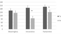 Sixty gesture-videos have been selected, 20 for each gesture category (Meaningless, Intransitive and Pantomime, see Fig. 3 for some examples and the Supplementary Information for a full list of the gestures used). Half of them was performed with the right hand and the other half was the same gestures performed with the left hand. Then, half was executed toward the body, the other half away from the body. Overall, no difference between gestures performed with the right and left hand in terms of response time, t(13) = 1.1, p = 0.31 and accuracy, t(13) = 0.59, p = 0.56, was observed, therefore, response time and accuracy registered in both hands were grouped together for the following analyses. Since data on RT normally distribute (skewness range: −0.62 to 0.92; kurtosis range: −1.1 to 1.8) and sphericity assumption was not violated (Mauchley test p > 0.5), a 3 (Gesture type: Meaningless, Intransitive and Pantomime) X 2 (Direction: toward and away from the body) ANOVA for repeated measures was run on response time. Results showed only a main effect of Gesture type, F(2, 26) = 7.97, p = 0.002 ηp2 = 0.38. No main effect of Direction, F(1, 13) = 3.1, p = 0.11 ηp2 = 0.19 and no interaction Gesture type × Direction was observed, F(2, 26) = 2.1, p = 0.14 ηp2 = 0.14. Fisher Post hoc analyses showed that participants took more time to respond to Meaningless (M = 2.72 s, SD = 0.28) than to both Intransitive (M = 2.45 s, SD = 0.27; p < 0.001) and Pantomime gestures (M = 2.57 s, SD = 0.29, p = 0.04), with no difference between Intransitive and Pantomime gestures (p = 0.10). It takes more time to provide “no” answers than to affirm that a meaning is present in the gesture observed. In terms of accuracy, data did not normally distribute. Friedmann ANOVA for repeated measures did not show any significant difference among the 6 Gesture types, χ2(5) = 6.1, p = 0.29 (Mdn = 100% for each gesture).