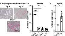 Transduced MSCs were seeded into 12-well plates at a density of 50,000 cells/well. The next day, medium was changed to osteogenic media (MEM-α + 10% FBS supplemented with 0.2 mM ascorbic acid, 0.1 μM dexamethasone, and 10 mM β-glycerolphosphate) and cultured for up to 28 days with medium changes every 3–4 days. RUNX2 and BSP mRNA levels were measured at days 1 and 14 respectively. At day 28, mineralization was measured using Alizarin Red S staining. In brief, cells were fixed with 10% v/v formalin solution for 15 minutes, washed once with PBS, stained with 1% w/v Alizarin Red S (ARS) indicator (Ricca Chemicals, cat# R0500000) for 20 minutes, washed twice with PBS and documented photographically. Then, wells were incubated with 10% v/v acetic acid for 30 minutes, scraped for further dissociation of cells, vortexed for 30 seconds and centrifuged at 12,000 × g for 15 minutes. Optic density of the supernatants was measured using a plate reader at 405 nm.