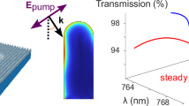 This indicates that a Brewster-like quasi-BIC appears at \(({\omega }_{0},\pm \phi )\) due to the symmetry-protecting mechanisms: angular locking to a single scattering channel by the array periodicity, and forbidden scattering at a given angle determined by the single dipole resonance orientation. Actually, when \(\phi =0\) (perpendicular dipole array, see Fig. 1a,b), this is strictly verified and a proper BIC with diverging Q factor emerges (T~1). However, when \(\phi \ne 0\) (oblique dipole array), the canonical BIC becomes a quasi-BIC with large, but finite, Q factors, since outgoing channels are allowed. These quasi-BICs nonetheless exhibit a rich phenomenology, making them inaccessible through plane wave illumination at given angles (see Fig. 1c–f), as follows. In turn, there is a slight difference depending on the sign of the angle of incidence, θ = ±φ, so that only scattering into reflection/transmission, respectively, is forbidden; reflection is identical due to reciprocity, but transmission reveals subtle differences. When the incident wavevector coincides with the resonant dipole orientation (θ = −φ, Fig. 1c), coupling is forbidden and all the energy is directly transmitted through (R~0, T~1). Conversely, if the specular reflection direction coincides with the dipole orientation (θ = φ, Fig. 1e), the incident wave couples into dipole resonances: however, dipole emission in reflection is forbidden (R~0), but not in transmission, which, in spite of that, leads to total transmission (T~1, Fig. 1e) thanks to incident wave cancelation. At any other angle of incidence (θ ≠ ±φ), resonant excitation and emission is allowed and the wave is totally reflected (R~1, Fig. 1b,d,f). To summarize, a quasi-BIC with slightly smaller Q factors appears at oblique incidence that becomes inaccessible at given (Brewster) angles.