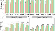 Spikelet number is considered the primary determinant of grain yield in rice under favorable conditions22, and plant density and N rate are two key crop management factors for achieving a high spikelet number12,21,23. In the present study, although the significance of the combined effect of hill density and N rate on spikelet number varied across years for both tested cultivars, the trend was consistent, i.e., the highest spikelet number was achieved in the combination of high hill density and moderate N rate for Y-liangyou 1 and in the combination of moderate hill density and high N rate for Luoyou 9348 (Fig. 2A–D). The cultivar difference in response to combinations of hill density and N rate may be related to plant type and to N sensitivity. Y-liangyou 1 is a cultivar with a compact plant type (erect leaves) and lower N sensitivity, while Luoyou 9348 is a cultivar with a loose plant type (droopy leaves) and higher N sensitivity. These facts suggest that the regulating effect of hill density and N rate on spikelet number is dependent on cultivar characteristics.