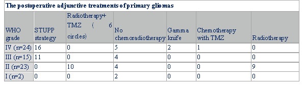 Regarding to the treatments, the patients were handled with postoperative adjunctive thera-pies according to the clinical guidelines for gliomas in 2016, while some patients did not accept the normal therapy due to economic burden, age, and other factors. As for glioma pa-tients with WHO grade IV, 16 patients were treated with the STUPP strategy, however 5 pa-tients rejected to accept chemoradiotherapy. As the intracranial increase of pressure induced by the effect of edema in the procession of radiotherapy, 3 patients stopped accepting the treatments. 2 of them were managed with gamma knife, and 1 was treated with TMZ (200mg/m2/d, d1-5, one circle is 28 d, 6 circles). In terms of glioma patients with WHO grade III, 11 patients were conducted with the STUPP strategy, while 4 patients refused to receive chemoradiotherapy. With respect to glioma patients with WHO grade II, first of all, by identifying risk factors, we respectively established high and low risk group. The high-risk group with 10 patients were treated with radiotherapy and TMZ (200mg/m2/d, d1-5, one circle is 28 d,6 circles), however the low risk group of 9 patients were handled with ra-diotherapy merely. 2 patients refused to accept chemoradiotherapy and another 2 patients were only received follow up closely due to prediction of good survival. As for the glioma patients with WHO grade I, all patients (n=2) were underwent operations without chemora-diotherapy and continued follow up regularly.