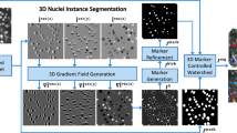 where T is the set of ground-truth data, S is a probability map of the 3D binary volumetric segmentation, and \({\mu }_{1}\) and \({\mu }_{2}\) are the weight coefficients for \({L}_{DICE}\) and \({L}_{BCE}\), respectively. The combination of two loss functions improves segmentation performance since \({L}_{DICE}\) constrains the shape of the segmented nuclei while \({L}_{BCE}\) effectively predicts the binary classification (nuclei/no nuclei) of each voxel. As a post-processing step, a 2D watershed35 is used sequentially in each of the three orthogonal planes to separate overlapping nuclei in a quasi 3D manner.