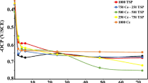 The polarization curves show the breakdown of the passive film before and after the addition of BTC inhibitor at pH 12.5, see Table 2. However, increasing the inhibitor concentration shifts the pitting potentials (Epit), towards the more noble values indicating that the passive layer formed more stabilized by the presence of BTC inhibitor. Moreover, the passive potential window at pH 12.5 is 0.18, which increased to 0.25, 0.27, 0.32 and 0.38 by the addition of 12, 24, 37, 50 μmol L−1 of the BTC inhibitor, respectively. The attack of chloride species to the reinforcing steel surface in SCP can lead to loss of its passive layer if the concentration of the chloride species is adequately high. For reinforcing steel in concrete, the degree to which Cl¯ ions can damage the passive layer is related to the alkalinity of the environment. In chloride-free alkaline conditions, the passive layer on the mild steel breaks down at a potential of +560 mV SCE38. The highest attained IE% was 88% at 50 μmol L−1 of the BTC inhibitor at pH = 12.5. It can be seen that the values of ba and bc diminished upon the addition of the inhibitor indicating that BTC is a mixed type inhibitor. it is noteworthy to mention that the tabulated values of the corrosion density (icorr), shifts towards decreases with increasing the concertation of the BTC inhibitor. However, these values are not in accordance with reported articles in references12,39. In fact, the diffusion of chloride species (Cl−), in cementitious materials immersed in saline water is a difficult process, which includes numerous chemical and physical interactions. Cl− ions can bound chemically or physically through the cement paste, thus reducing the segment of free Cl− species that can diffuse easily in the concrete pore solutions. Furthermore, the internal electric field generated from the anions and cations will accelerate the ions that possess low diffusion coefficients and decelerate the ions that have high diffusion coefficients in order to keep the electro-neutrality status40.