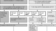 Cylindrical enamel slabs (diameter 5 mm, 19.63 mm surface area, 1.5 mm height) were gained from the facial surfaces of bovine incisors of two-year old cattle (BSE-negative animals). Slabs with structural alterations of the enamel were excluded from the study. The surfaces of the enamel slabs were polished with wet grinding abrasive paper (400–4000 grit) and the smear layer was removed by ultrasonication (us) with NaOCl (3%) for 3 min36. After double washing in distilled water for 5 min (us), the slabs were disinfected in ethanol (70%) for 30 min. Afterwards, they were washed in distilled water again37,38. Before oral exposition, the enamel slabs were stored in 4 °C aqua dest. for 24 h to form a hydration layer37,38,39.